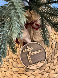 Create a meaningful holiday keepsake with this custom family name ornament, beautifully crafted in a crossword-style design. This 3.5-inch round laser-engraved wooden ornament is fully personalized with your family’s names, making it the perfect addition to your Christmas tree.